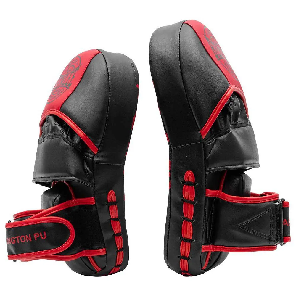 The Hook & Jab pads ´´ABINGTON PU´´ made of tough artificial leather with curved design are perfect for punch and also kicktraining. Complete with inset palm ball for extra comfort and fitting. Adjusable strap with hook and loop closure for further support and performance.