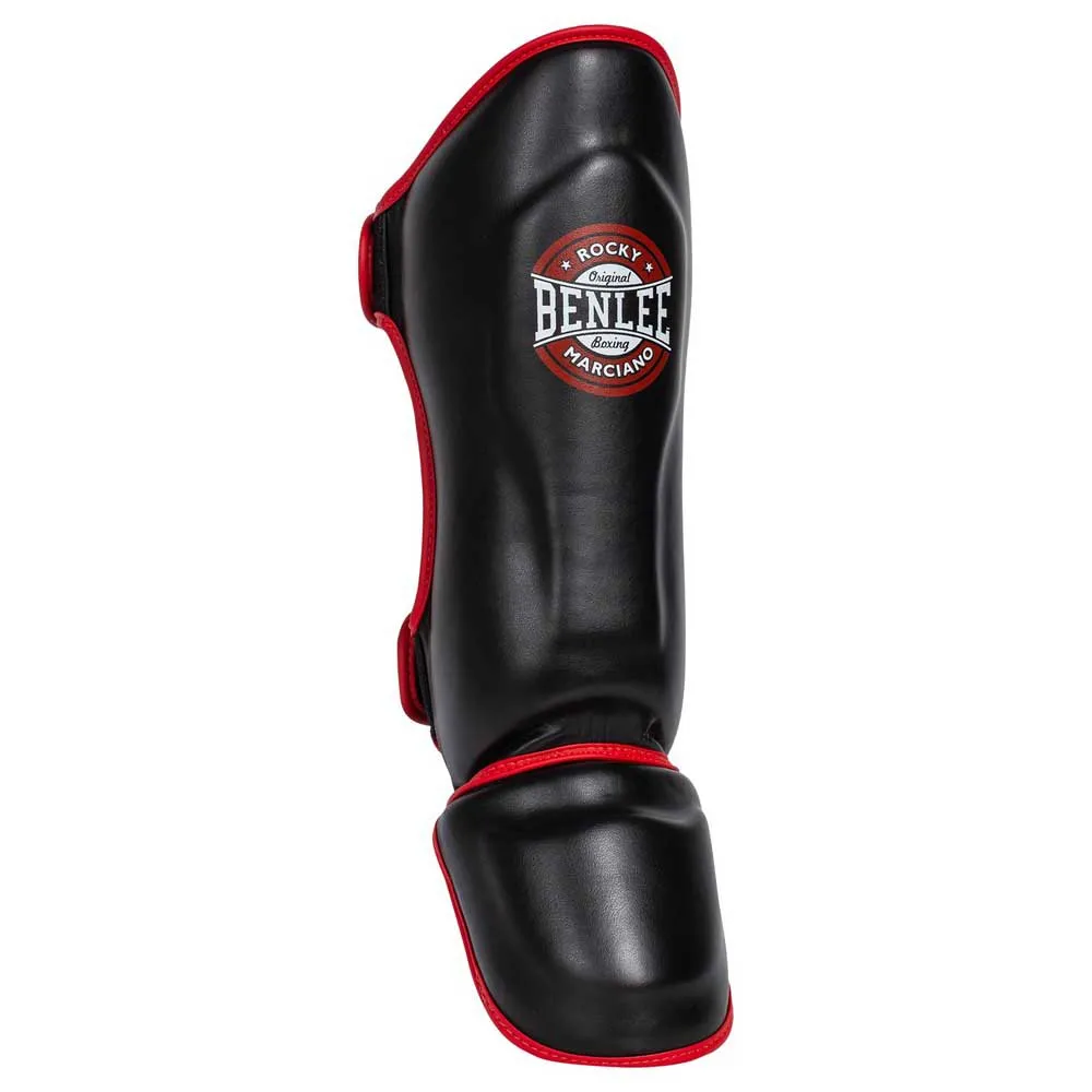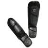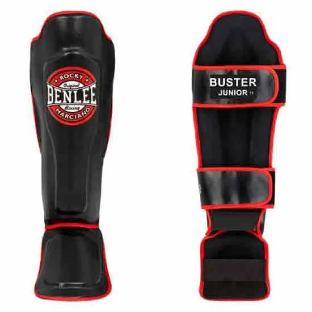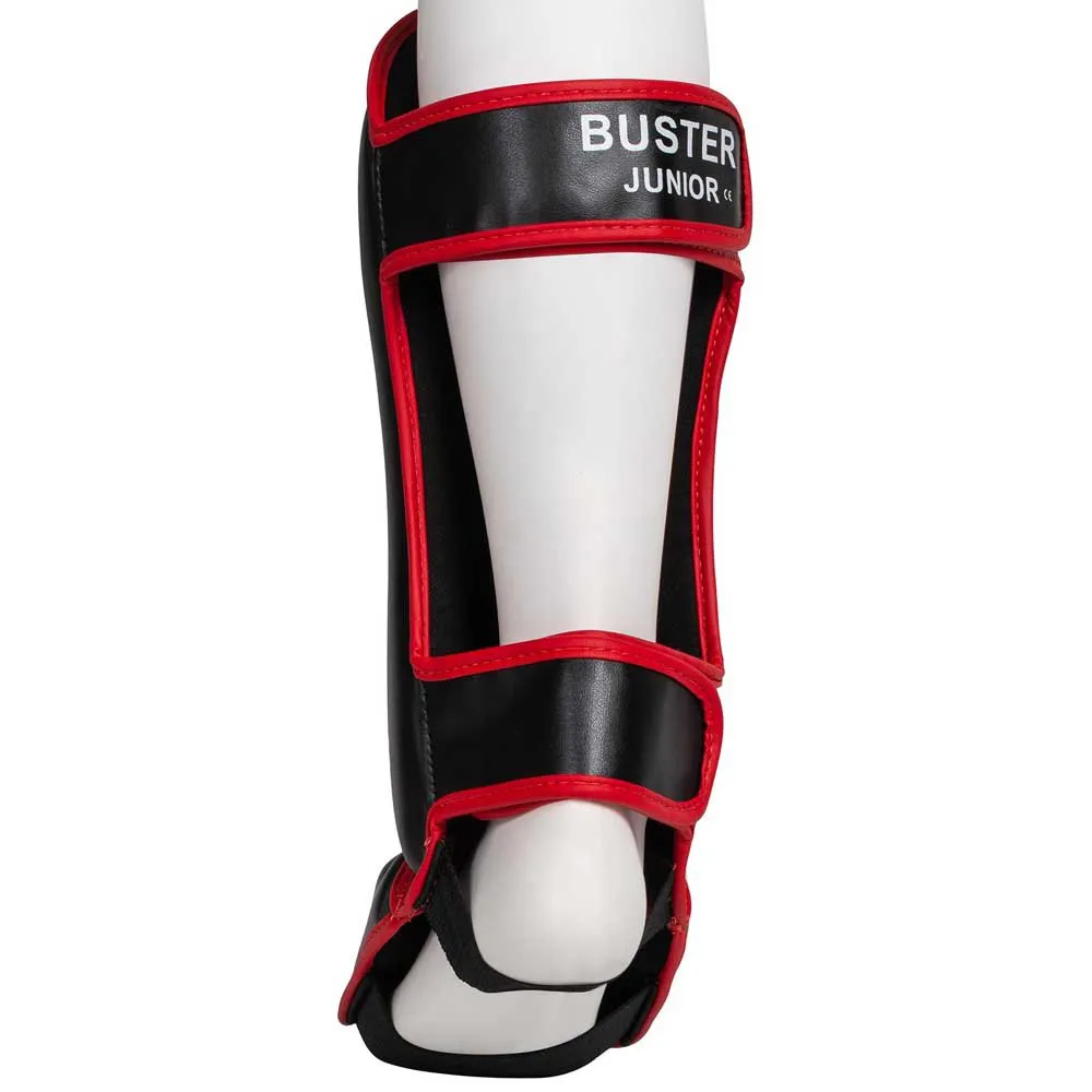 Shin guards made of synthetic leather with anatomically shaped padding made of impact-absorbing foam. Additional padding on the shin and instep provides further protection. There are two circumferential Velcro fasteners on the back and two elastic loops on the foot for a firm and secure hold. BUSTER reliably protects during professional training of kicking techniques and also looks cool thanks to the printed logo.