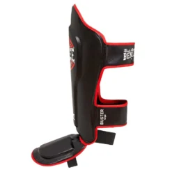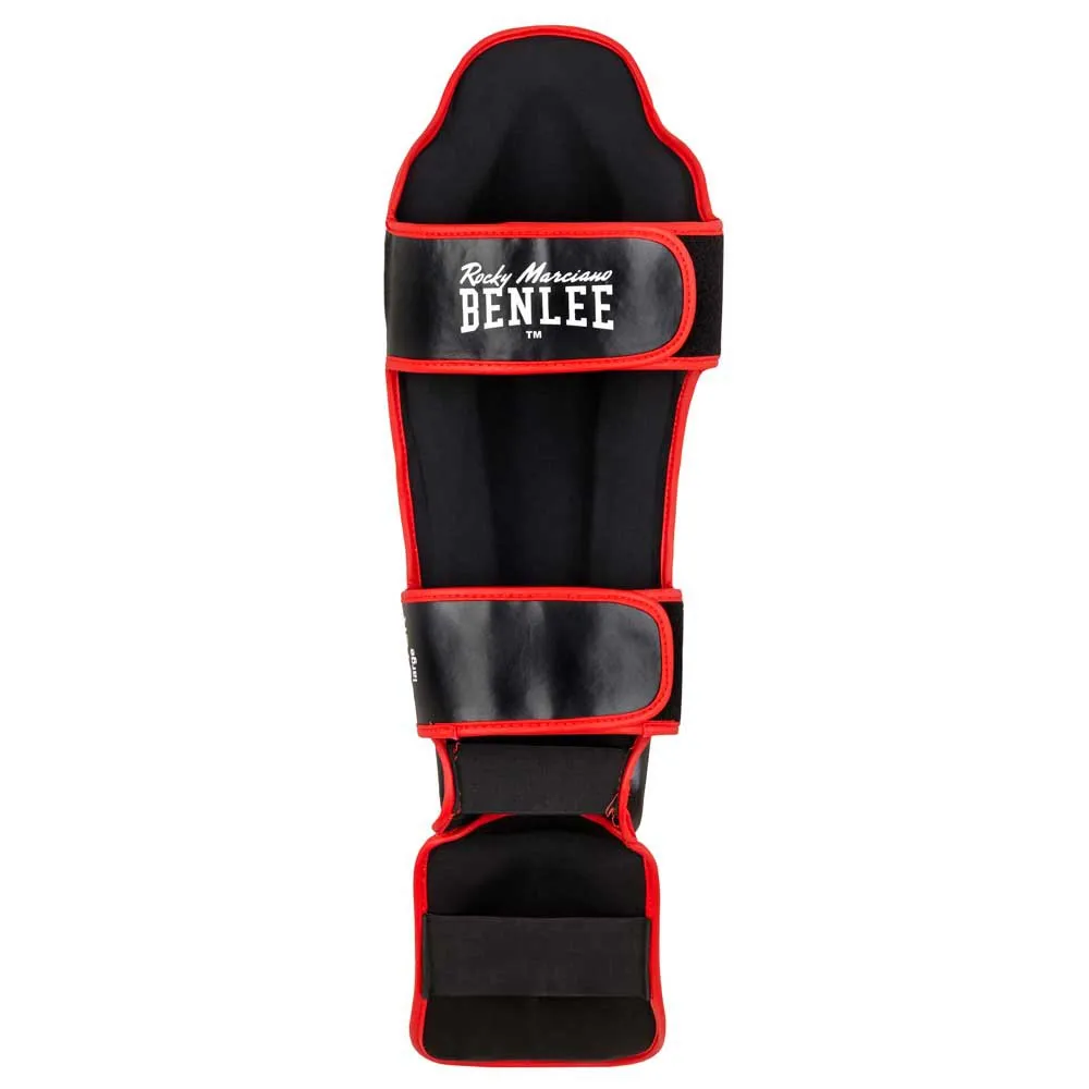 Shin and instep guard of synthetic leather with anatomically pre-shaped padding made of high impact absorbing foam and extra padding on the shin and instep. Two hook and loop fasteners at the calf and two elastic loops at the foot pads for a secure fit. Provides reliable protection during the professional training of kicking techniques.