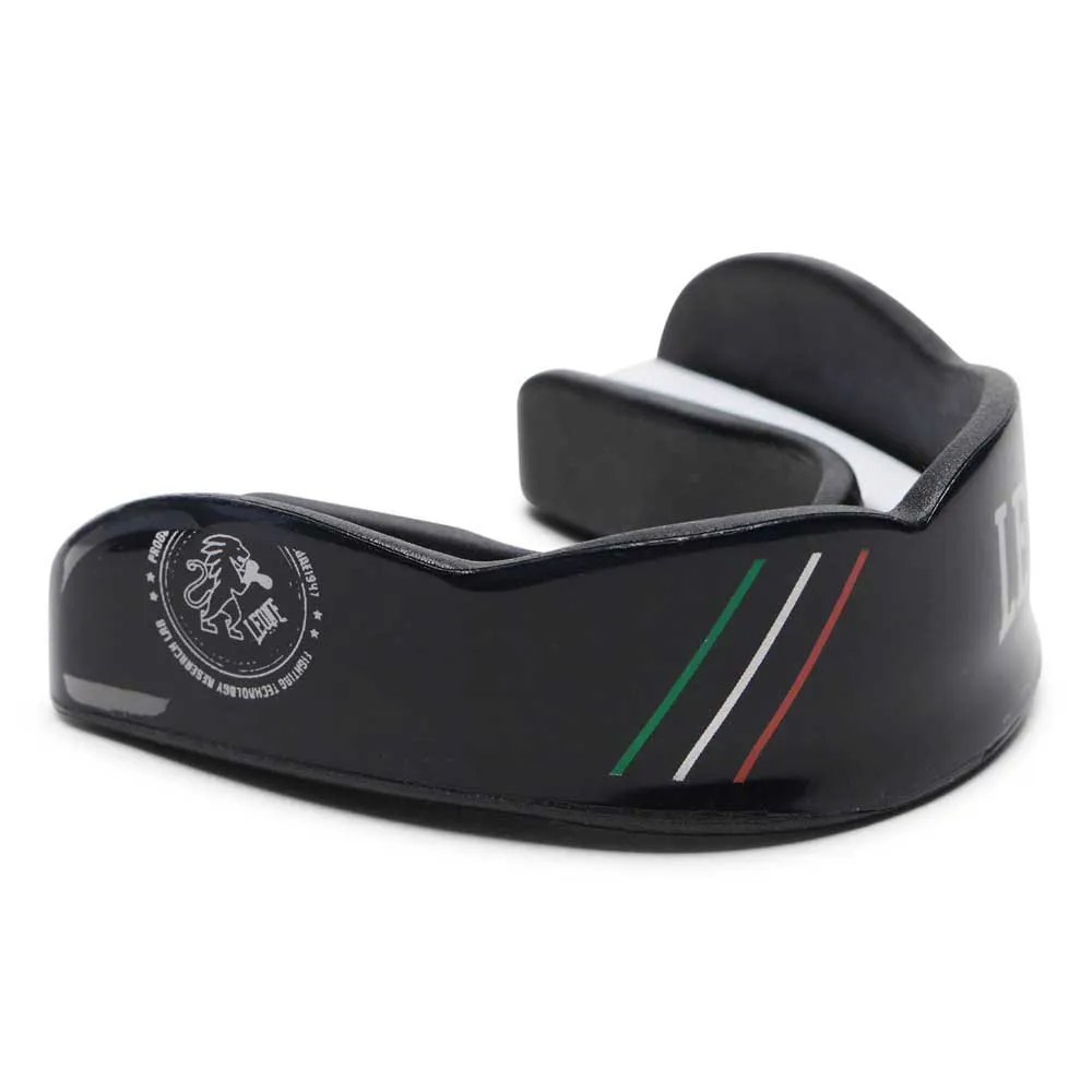 Custodia inclusa. High intensity thermoplastic polymer molds to custom perfection and coverage for all contact sports. Individual carry case included.