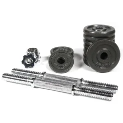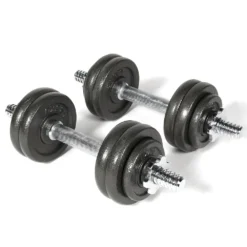 Dimensions : 40x25x15cmweight : 15.00kgcolor : greymaterial : metal fibercontents of the kit: 8×1.25 kg – 4×0.5 kg – 2 dumbbells of 35cm – 4 stop disc