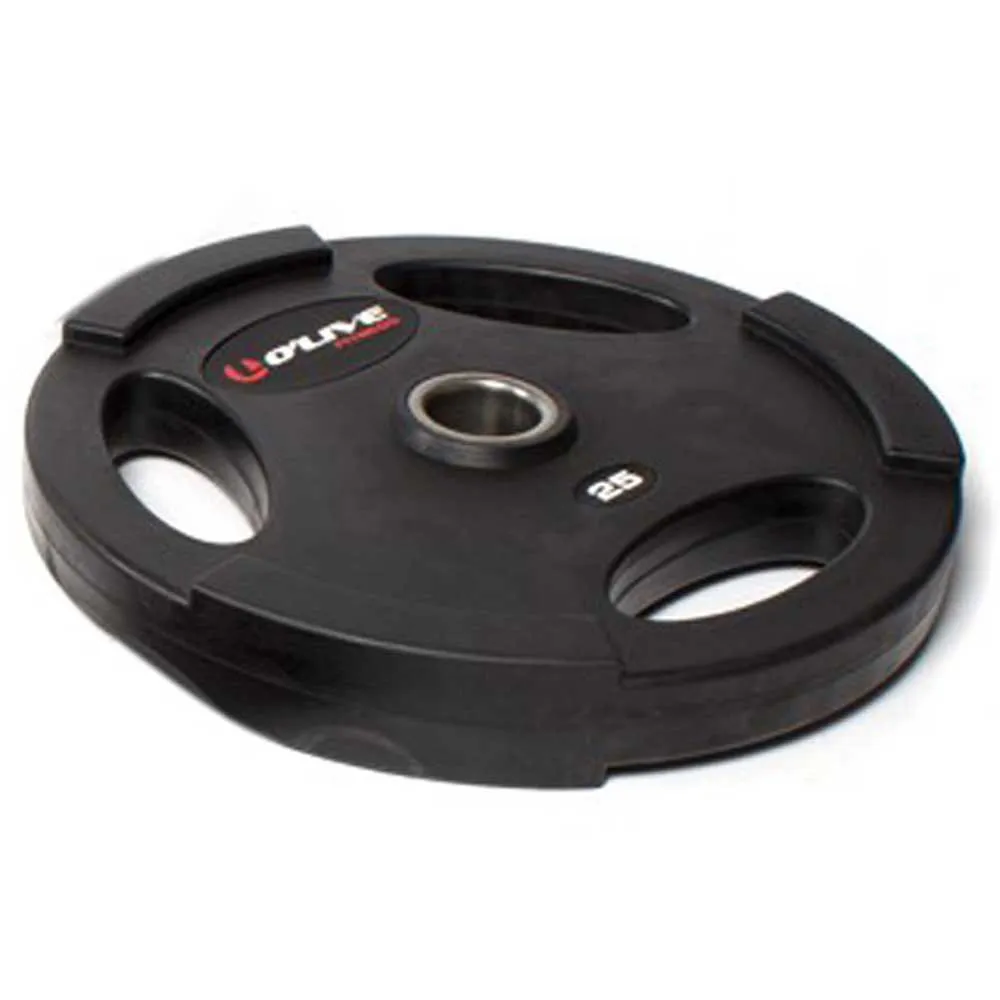They have a nice to touch coating of high quality shock resistant rubber. Their ergonomic design includes special handles which facilitate gripping. They also include a tool to facilitate disc removal from the bar and to pick them up from the floor. The inner hole is the 50 mm and is protected by a steel ring which allows a smooth rotation of the disc on to the bar. For easy weight identification the discs show the weight embossed and coloured. Sold in units.