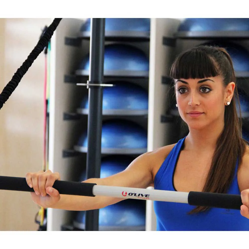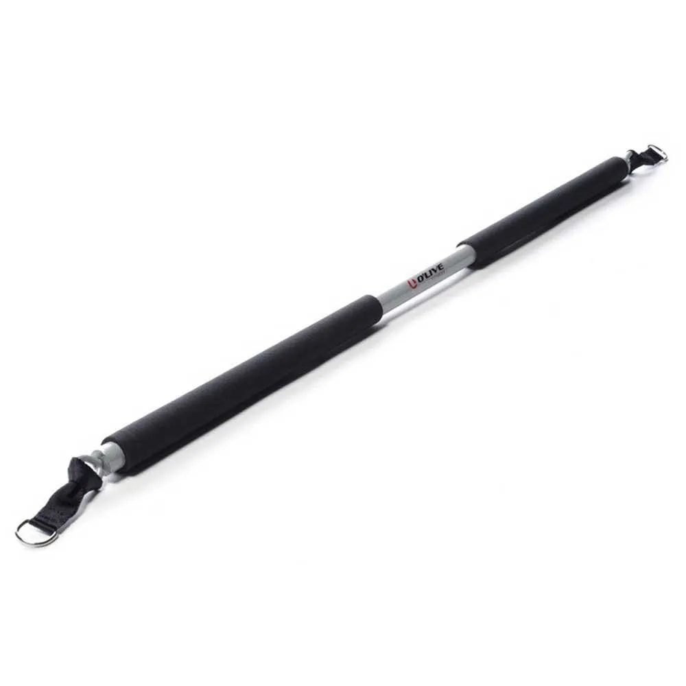 The Resist bar consists of a 105 cm long metal bar with both ends terminated in a rotating anchor ring for the elastic cords. The bar is covered with a non-porous high density rubber which allows a comfortable and secure grip