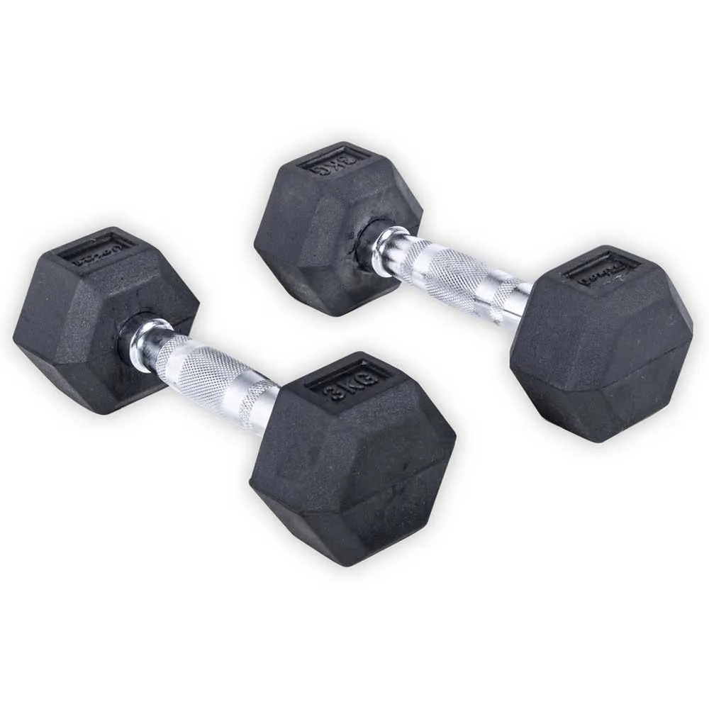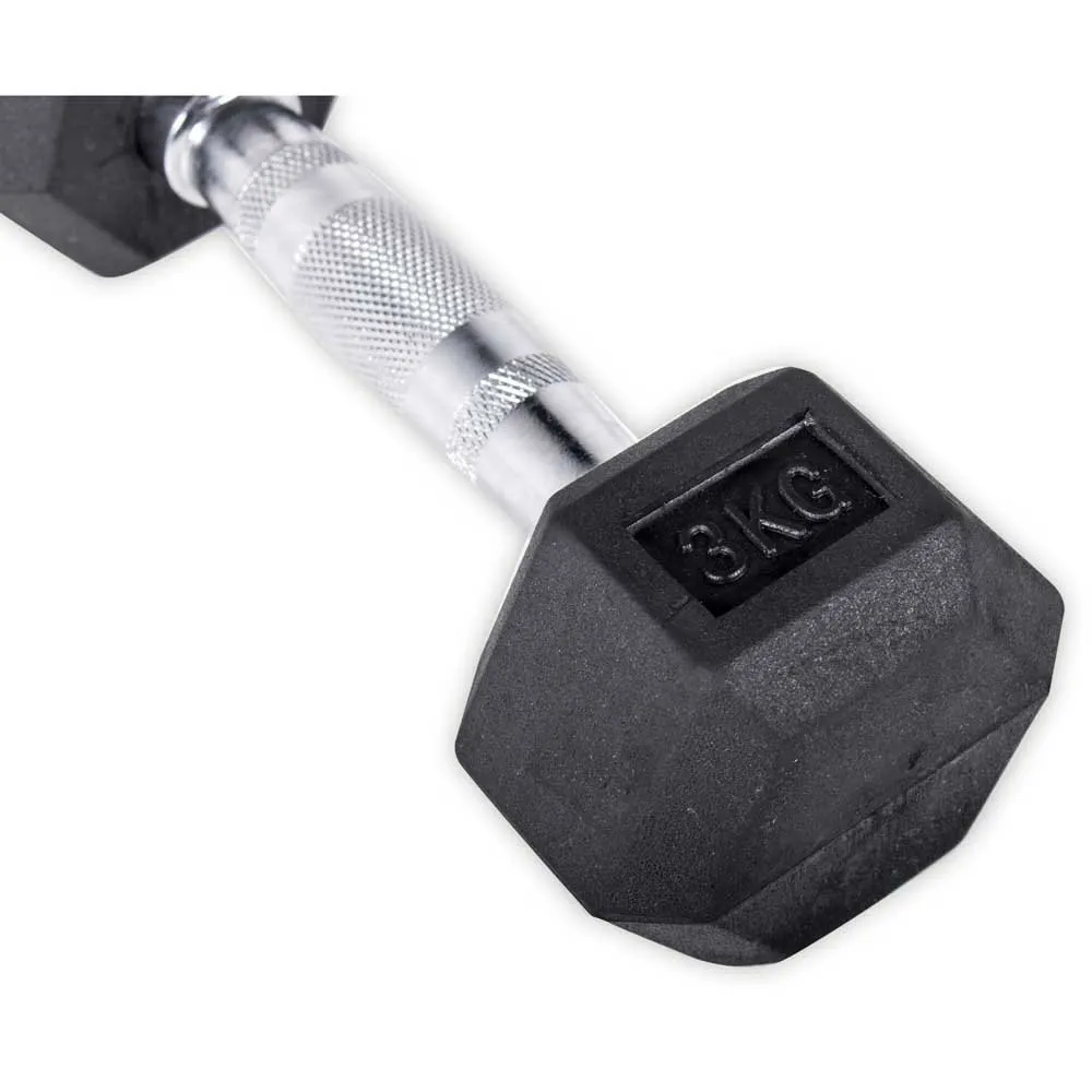 Rubber dumbbells with chrome ergonomic handle, slightly contoured for easy grip and increased safety. The rubber coating increases the durability, protects the floor and the equipment, improves appearance, reduces noise and are easy to clean. Sold in pairs.