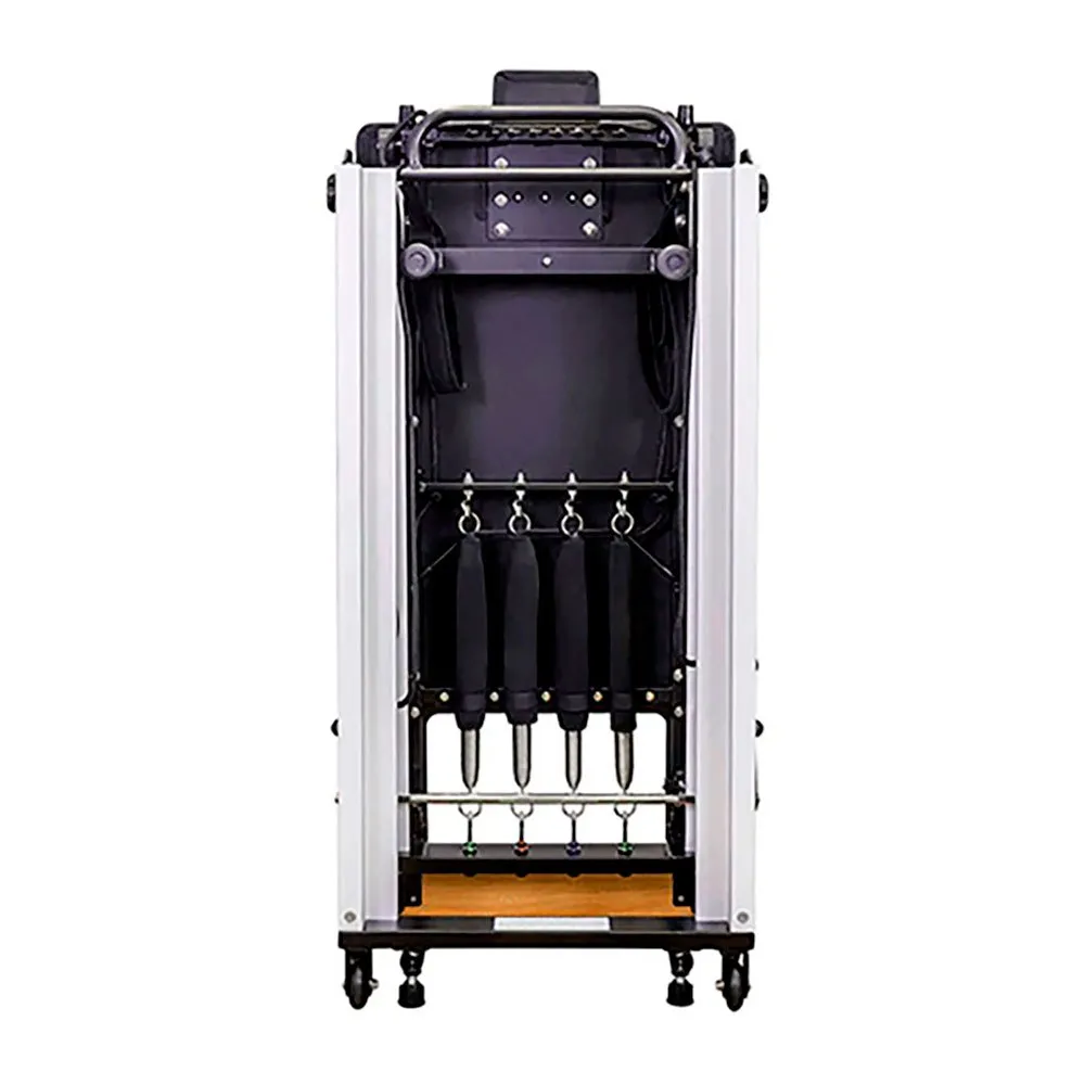 The F3 Pilates Reformer is a self-contained machine which can be easily wheeled around and stored safely out of the way when folded up, so it does not need to take up any space when not in use. Folds up in a matter of minutes into a compact and self-contained machine. Simply unfold in your living room or a clear area, get your workout in and fold back up and store out the way until the next time. The F3 can be used for jumping exercises with the addition of the F-Series Jump Board. We recommend that the F3 Reformer is opened and closed by two people. However, the F3 can be opened and closed by a single person with relative ease, as the lifting weight is similar to lifting a heavy suitcase.