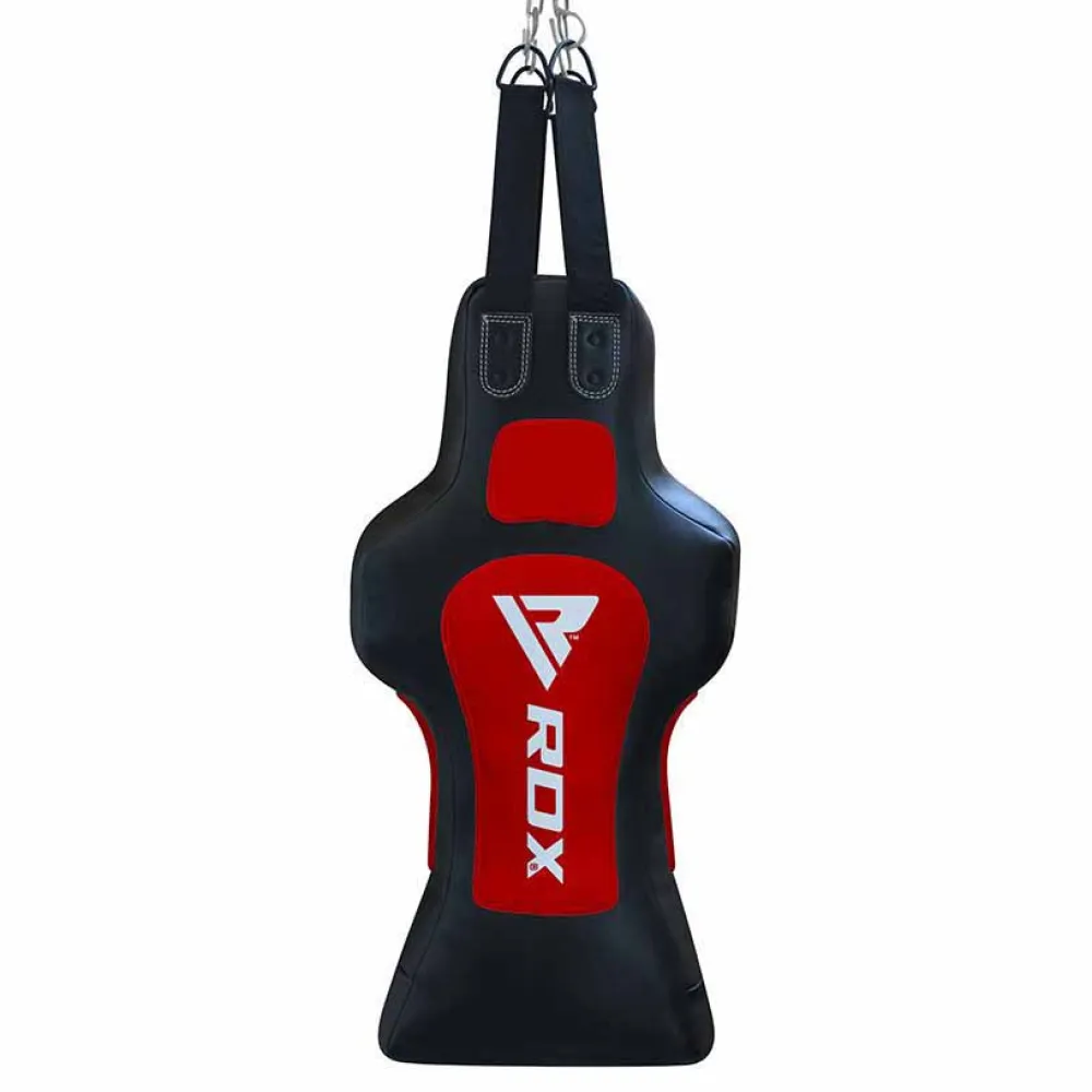 A hanging torso punch bag, designed to enhance your training routine and hone your combat skills for boxing, MMA or other contact sports. Shaped like a dummy, fighters can practice sparring or improve clinch, knees and body kicks. This is a hybrid body punch bag that comes complete with matching gloves and features a waterproof outer, a tear resistant lining, and a secure nylon built strap for an unbreakable hold no matter what you throw at it. Anatomically engineered and the perfect size for coaching and flawless in-ring technique.