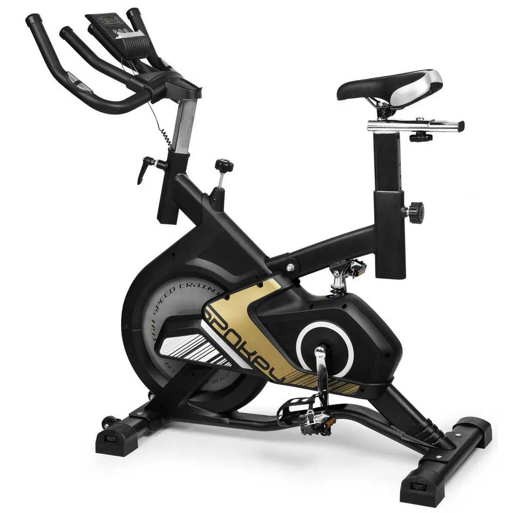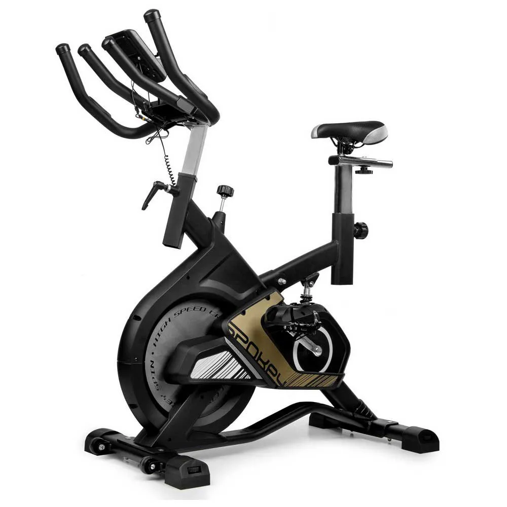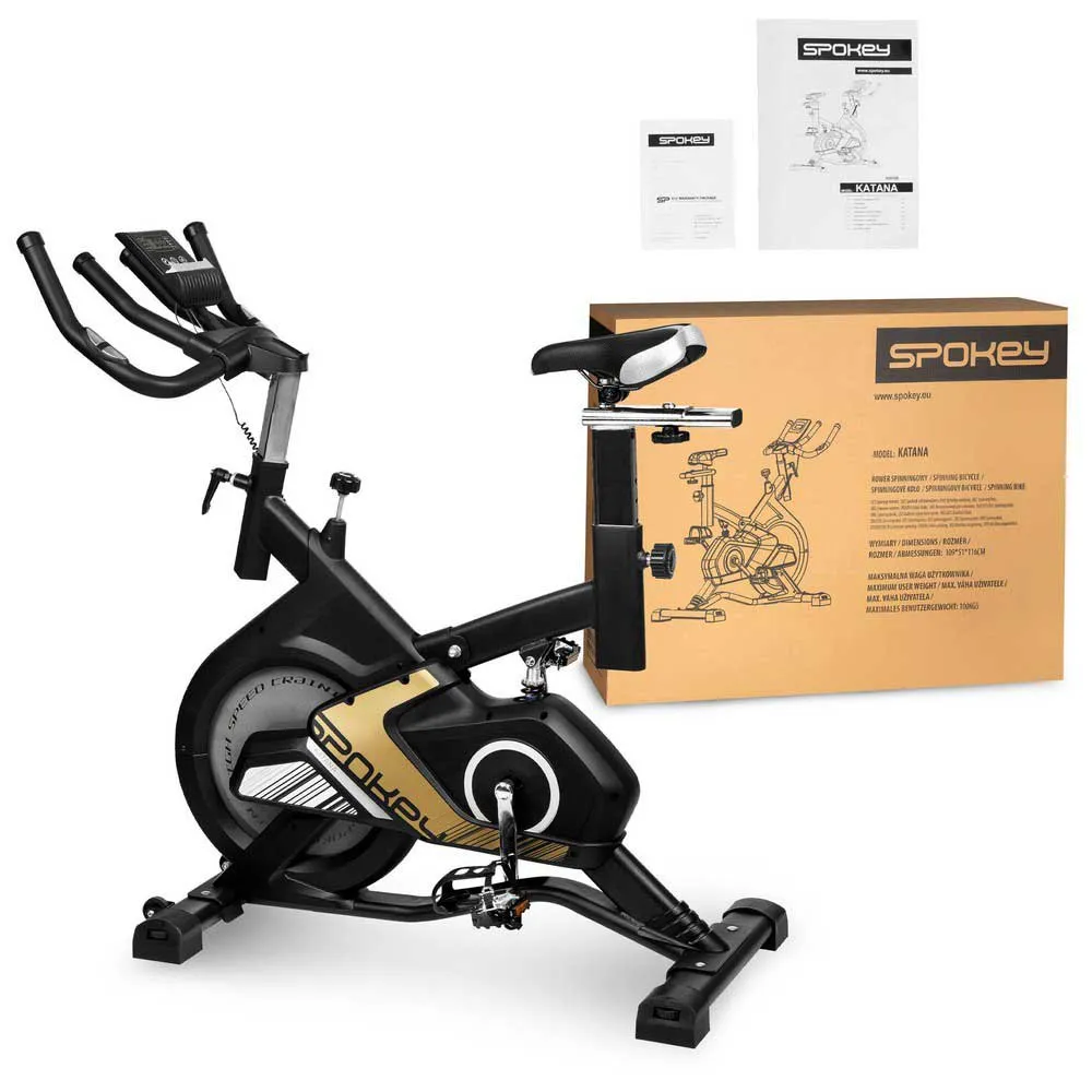 Parameters:Type:Spinning bikeFlywheel weight:13 kg Type of resistance:mechanical Number of degrees of resistance adjustment:8 manualMeasurement:time, speed, distance, calories, total distance Max user weight:100 kg Saddle height from – to:89 – 101 cm Dimensions:109 x 51 x 116 cm Additional features:- modern design- vertically and horizontally adjustable saddle and handlebar height – depreciation – steering wheel with a double grip – heart rate measurement – anti-slip pedals and a secure shoe holder – large monitor with space for a phone or tablet.