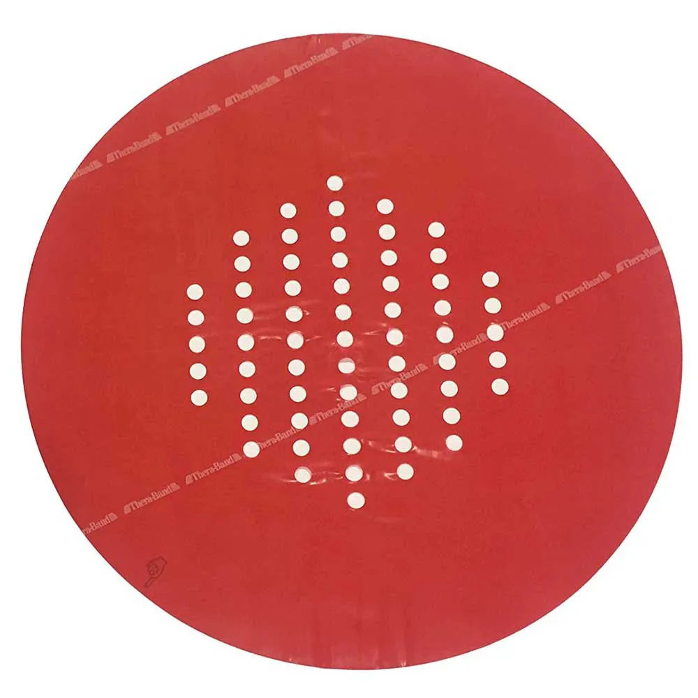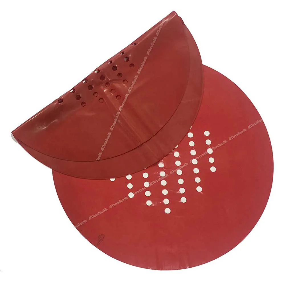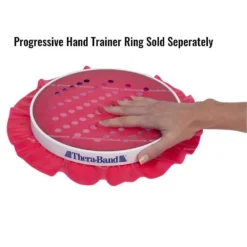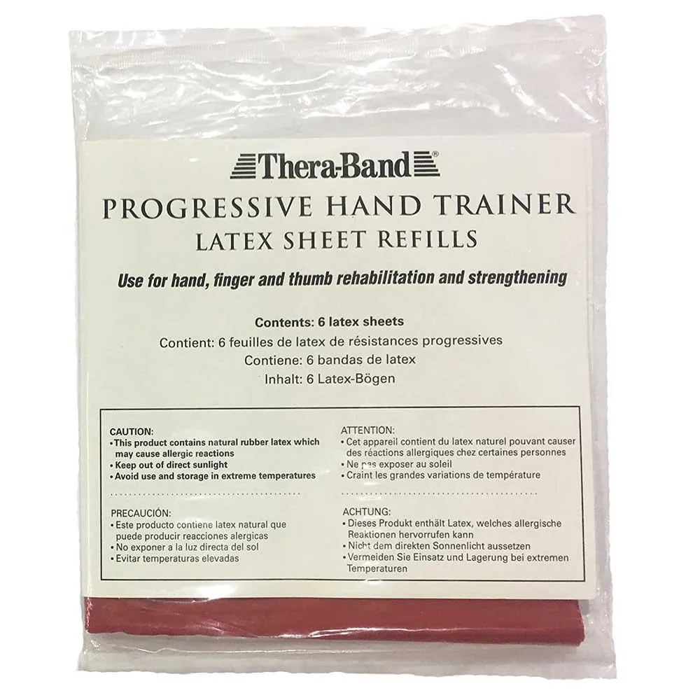 The Progressive Hand Trainer is composed of a pair of high impact, 10´´ and 10.5´´ diameter molded rings that lock a fitted, circular Thera-Band exercise sheet in place when pressed together. The Hand Trainer´s elastic sheets are supplied in the same colors and resistances as Thera-Band exercise bands, from tan (extra light) to black (extra heavy). With more than 60 access holes, the elastic sheets provide numerous strength training and range of motion exercises, including progressive extension exercises of the hand and wrist. Product Information Each Intro Kit contains an instruction guide that demonstrates proper exercises for a variety of applications, one set of rings and one each of the tan, yellow, red, green, blue, and black sheets. Refill sheets are supplied in sets of 6 sheets per individual color/level of resistance.