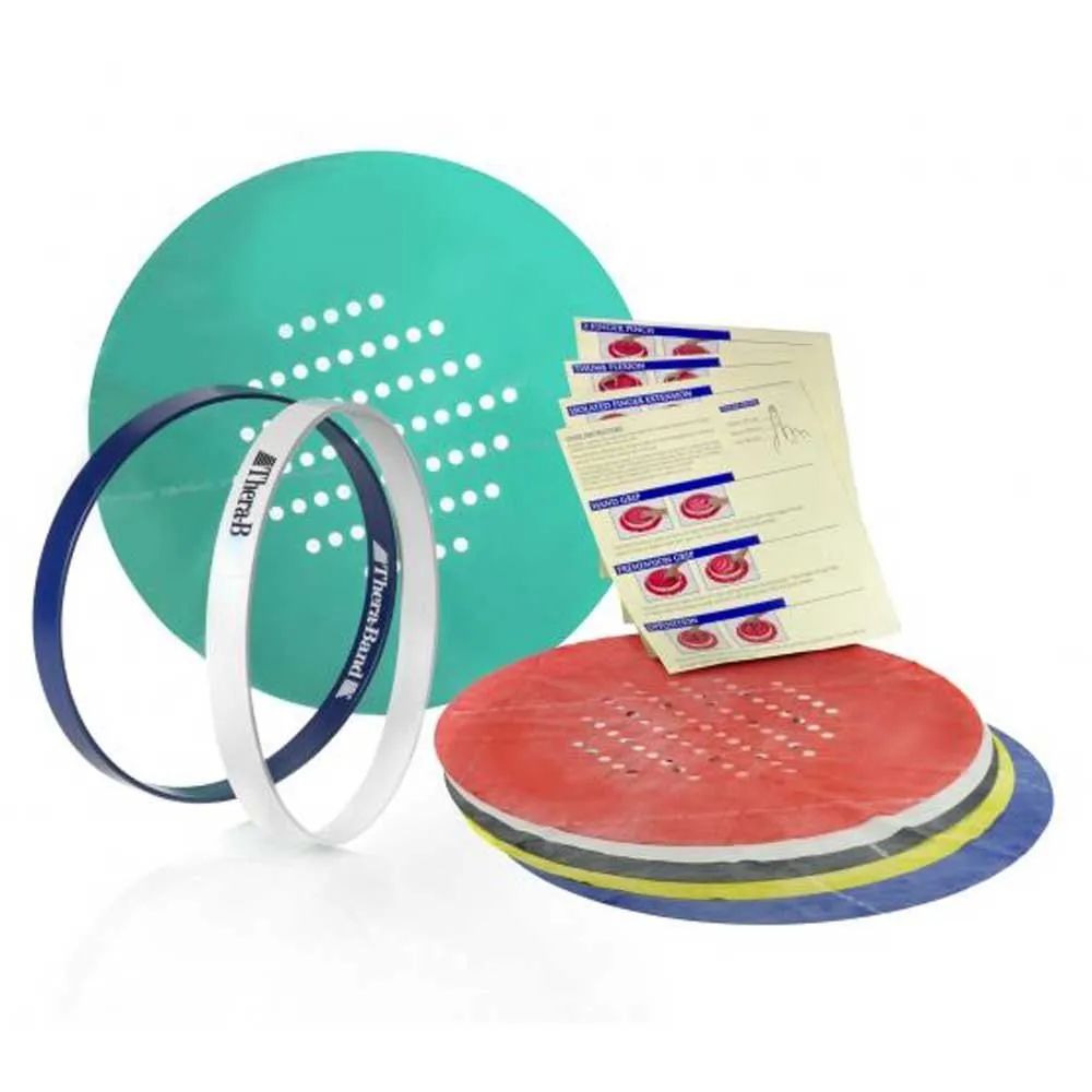 The Progressive Hand Trainer is composed of a pair of high impact, 10´´ and 10.5´´ diameter molded rings that lock a fitted, circular Thera-Band exercise sheet in place when pressed together. The Hand Trainer´s elastic sheets are supplied in the same colors and resistances as Thera-Band exercise bands, from tan (extra light) to black (extra heavy). With more than 60 access holes, the elastic sheets provide numerous strength training and range of motion exercises, including progressive extension exercises of the hand and wrist. Product Information Each Intro Kit contains an instruction guide that demonstrates proper exercises for a variety of applications, one set of rings and one each of the tan, yellow, red, green, blue, and black sheets. Refill sheets are supplied in sets of 6 sheets per individual color/level of resistance.