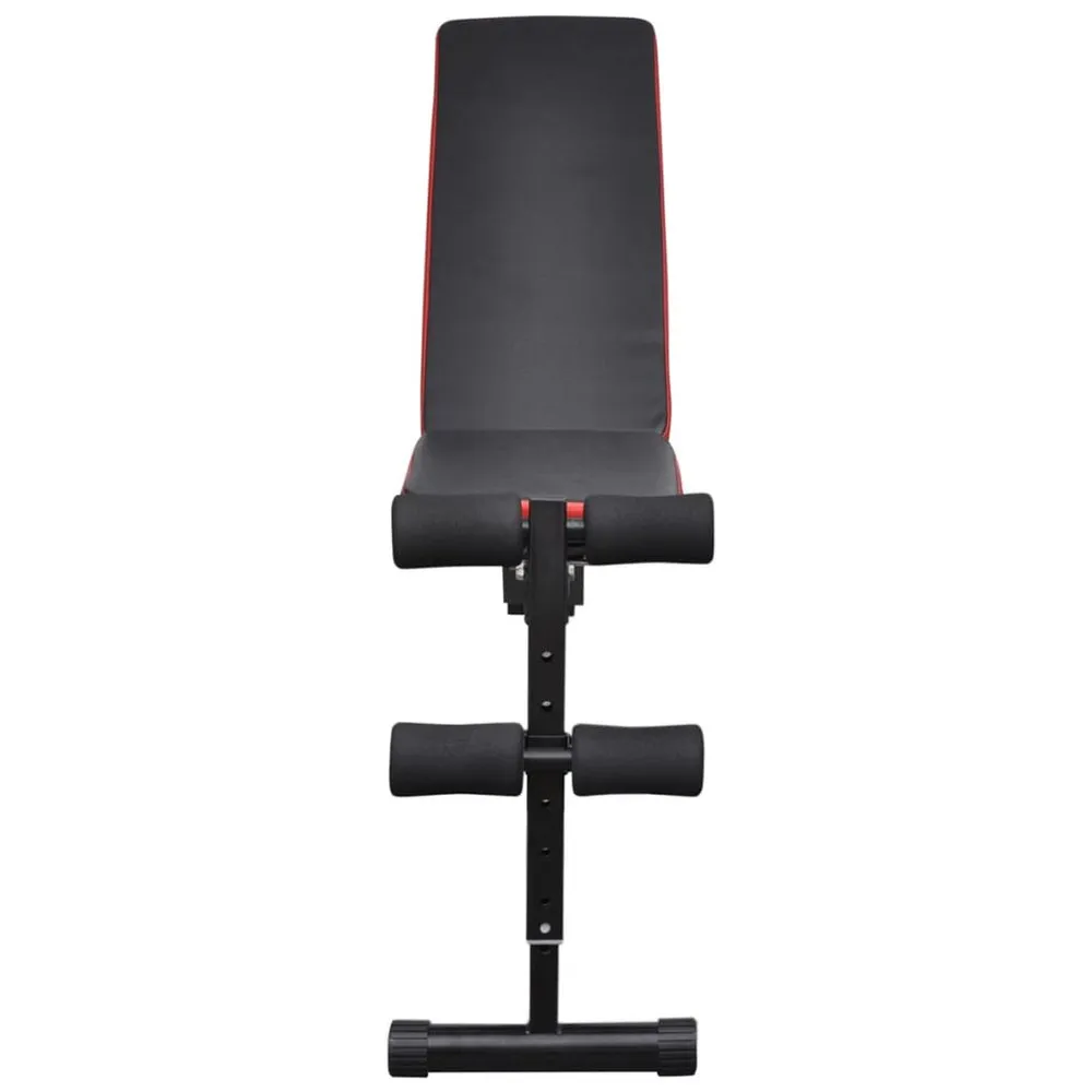 This high-quality, multifunctional sit-up bench, equipped with an adjustable seat and a backrest, is a great choice for people who like exercising at home. The bench is delivered with a barbell and dumbbell set. The backrest supports your back and shoulders, while the leg curl trains your thighs and legs. This multi-functional fitness workout bench allows for an effective, total body workout. Equipped with many adjustable knobs, the bench provides you with a great range of adjustment angles and heights; it, therefore, allows you to choose your desired position. The thick, padded seat is very comfortable, while the heavy-duty steel frame makes the bench stable and durable. The barbell and dumbbell set features solid chrome-plated bars with quick-action spring collars (for barbell bar), non-slip knurled grips, and fluted star-screw caps (for dumbbell bars) for secure attachment of the weight plates. You can work out without worrying about safety issues. The weight plates are made with a robust polyethylene casing. They can be combined in various ways for different training purposes. Delivery includes a sit-up bench, a barbell bar, two dumbbell bars, six 1,25 kg weight plates, four 2,5 kg weight plates, four 5 kg weight plates, two 10 kg weight plates, four caps and two spring collars. Sit-up bench: Colour: Black and red Frame material: Steel Dimensions: 125 x 35 x 50 cm (L x W x H) Cushion thickness: 4 cm Net weight: 12 kg Maximum user weight: 150 kg The seat cushion has 3 adjustable settings The back support plate has 8 adjustable settings Barbell and dumbbell set: Weight plates with polyethylene casing Grip size: approximately 14,5 cm (barbell), 10 cm (dumbbell) 1 x 2 kg barbell bar: 2,5 x 140 cm (Diameter x L) 2 x 0,5 kg dumbbell bar: 2,5 x 45 cm (Diameter x L) 6 x 1,25 kg weight plate: 17,5 x 3 cm (Diameter x T) 4 x 2,5 kg weight plate: 22 x 4 cm (Diameter x T) 4 x 5 kg weight plate: 27 x 4,5 cm (Diameter x T) 2 x 10 kg weight plate: 32 x 5,5 cm (Diameter x T) 4 x Cap 2 x Spring collar Total weight including bars: 60,5 kg Total weight of plates: 57,5 kg