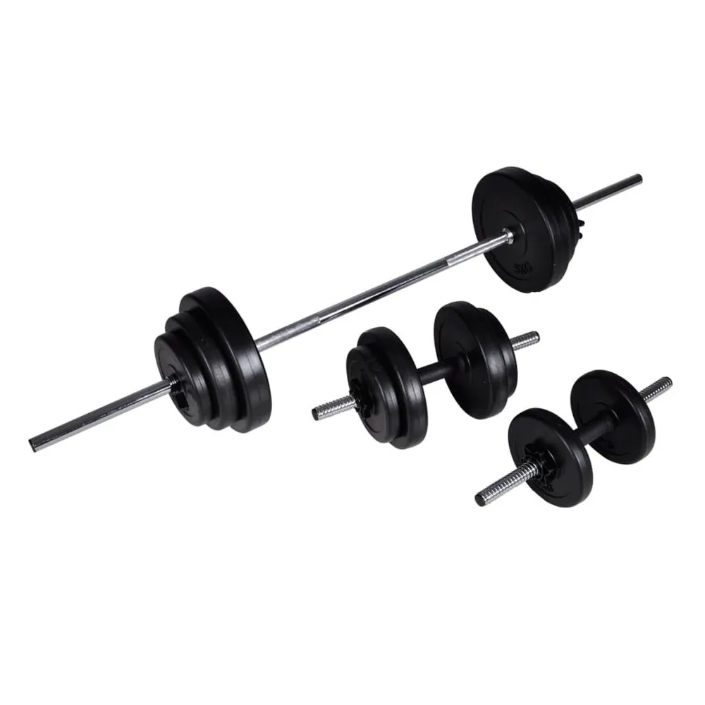 This set of barbell/dumbbell with weight discs will allow you to perform a large range of exercises more easily and safely at home or in the gym. This ergonomically designed set includes 1 barbell, 2 dumbbells, and 12 weight discs, total weight 30,5kg including the bars. The barbell/dumbbell set features solid chrome-plated bars with quick-action spring collars (barbell bar), non-slip grips, and fluted star-screw caps (dumbbell bar) for secure attachment of the weight discs. You can work out without worrying about safety issues. The weight discs are made with a robust PE casing. They can be combined in various ways for different training purposes. Delivery includes 1 x barbell bar, 2 x dumbbell bars, 6 x 1,25 kg weight discs, 4 x 2,5 kg weight discs, 2 x 5 kg weight discs, 4 x plastic collars and 2 x clips. Gripsize: approx. 14,5cm(barbell),10 cm(dumbbell) Weight Disc: Polyethylene casting Barbell bar: Ø2,5cm,length140cm, 2kg Dumbbell bar: Ø2,5cm,45cmlength, 0,5 kg 1,25kgweightdisc: Ø 17,5cm,3cmthick 2,5kgweightdisc: Ø 22 cm,4cmthick 5kgweightdisc: Ø 27cm,4,5cmthick Total weight including bars: 30,5 kg Total weight of discs: 27,5 kg