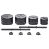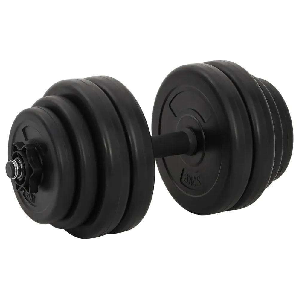 This ergonomic dumbbell set has a total weight of 30 kg (2 x 15 kg). The dumbbells have anti-slip plastic handles so you will be able to work-out without having to worry that the dumbbells will slip from your hands and fall. The screw-caps have star bolts to make sure that the weight plates are always mounted firmly and secure on the bar. The bar of the dumbbell is made of strong metal. The grip surface is approx. 14,5 cm. The weight plates are covered with robust, floor-friendly plastic, which allows you not to experience any annoying clanging sounds of the weights. 2 x 0,5 kg dumbbell bar: 25 mm x 45 cm (Diameter x L) 4 x 1 kg weight plates: Diameter 15,5 cm, 2,8 cm thickness 4 x 1,25 kg weight plates: Diameter 17 cm, 3 cm thickness 8 x 2,5 kg weight discs: Diameter 21 cm, 4 cm thickness Number of star locks: 4 (suitable diameter 25 mm) Filled with sand