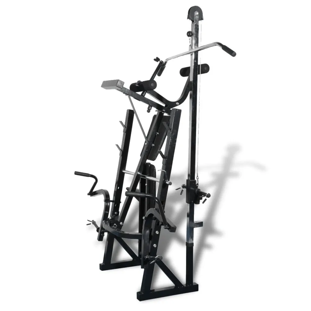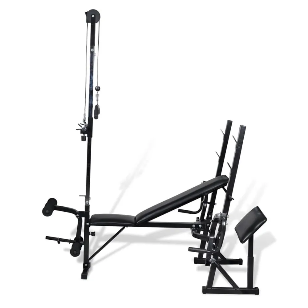 This adjustable fitness workout bench is a great choice for people like exercising. From now on, you can work out at the convenience of your own home, and save the trip and money to a gym! This workout bench actually provides a wide range of workout exercises to you. The backrest would strengthen your back muscles. Thanks to the curl and butterfly station, shoulders and arms could be exercised, while the leg-curl would train your thighs and legs. This wide range of workout combinations and exercises allow for an effective, total body workout, while the range of setting options enable the workout to be adapted to suit your specific need. The sturdy steel construction of the bench ensures your safety during the exercise process, allowing you to focus entirely on your workout. And the durable cotton-padded cushion will offer you a lot workout comfort. Dimension: 182 x 135 x 205 cm (L x W x H) Backrest size: 79 x 24 x 3 cm Seat size: 35 x 29 x 3 cm Arm curl cushion size: 40 x 24 x 3 cm Tube diameter for weights: 25 mm Max. user weight: 100 kg Max. leg extension weight: 25 kg Max. butterfly arm weight: 25 kg Backrest adjustable level: 3 levels, Min. 46 cm Max.82 cm Arm curl cushion adjustable level: 3 levels, Min. 75 cm Max. 85 cm Bar support adjustable level: 2 levels, Min. 98cm Max. 117 cm Material: Steel