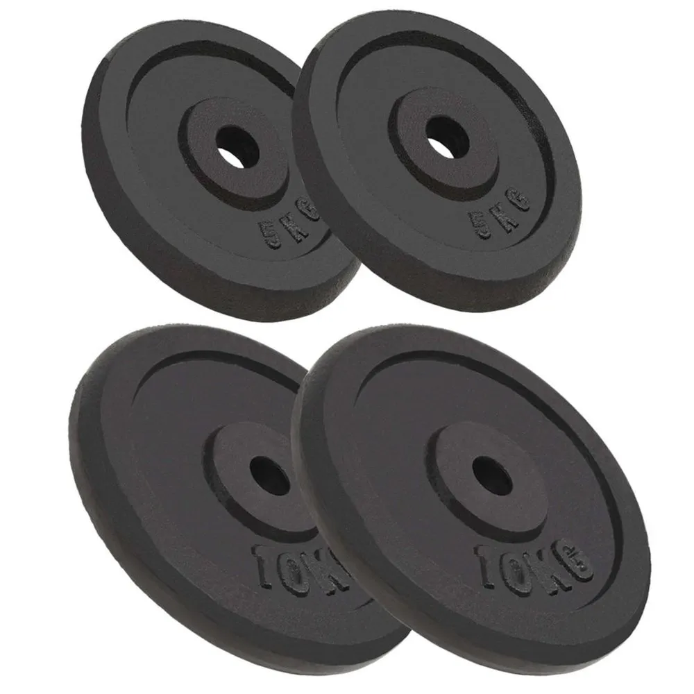 This set consists of two 10 kg weight plates and two 5 kg weight plates. It will be perfect for strengthening and shaping your muscles when used with a barbell bar, dumbbell bar or curl bar with a diameter of 30 mm. It is ideal for use at home or in a gym. These weight plates are made of high-quality cast iron with a lacquer finish. The weight is clearly stamped on each plate for quick and easy identification. Colour: Black Material: Cast iron with a lacquer finish Diameter of large plates: 27,5 cm Diameter of small plates: 21 cm Thickness of large plates: 3,4 cm Thickness of small plates: 2,9 cm Hole diameter: 30 mm Weight: 2 x 10 kg + 2 x 5 kg Delivery includes 4 weight plates