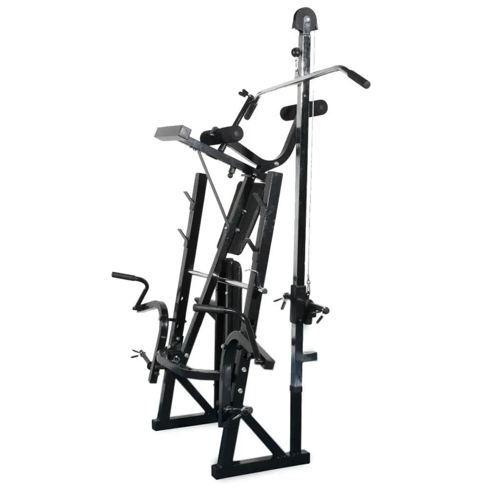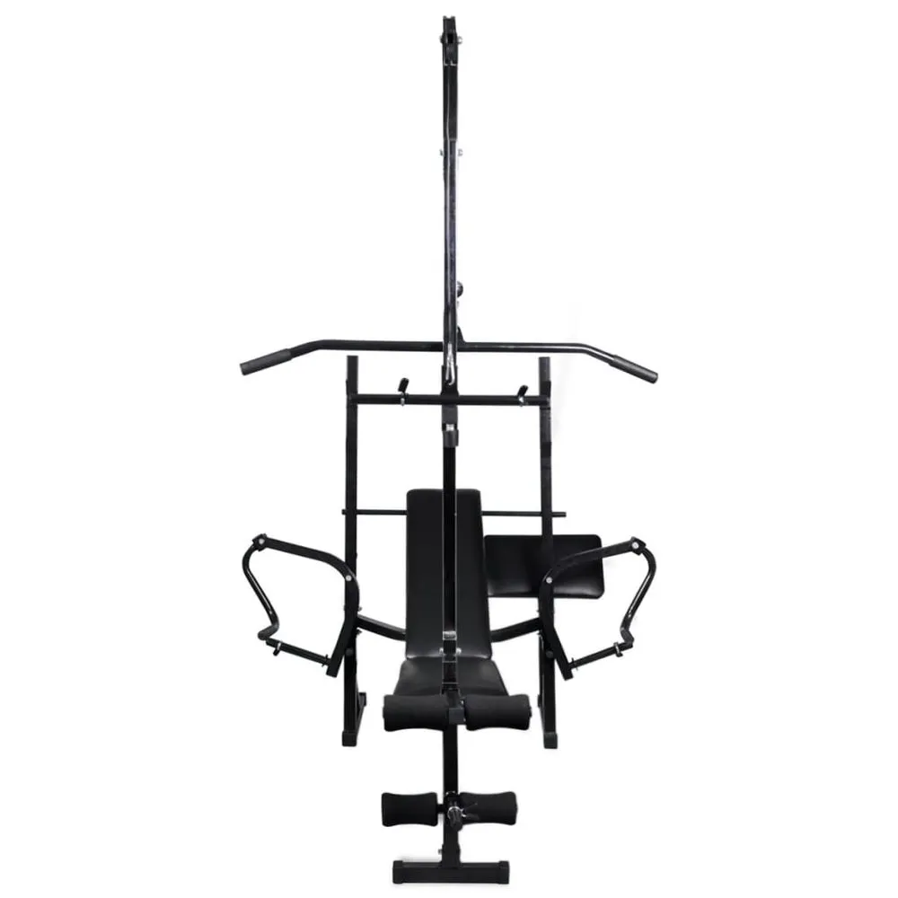 This adjustable workout bench with a weight rack and barbell and dumbbell set will be a great choice for working out in the comfort of your own home, and saves you the hassle and expense of going to a gym. This workout bench provides a wide range of exercise options. The backrest can strengthen your back muscles. Thanks to the curl and butterfly station, shoulders and arms will be exercised, while the leg-curl will train your thighs and legs. The wide range of workout combinations and exercises allows for an effective, total body workout, while the adjustable levels enable the workout to be adapted to suit your specific needs. The sturdy steel construction of the bench ensures your safety during the exercises. The durable cotton-padded cushion will offer you the utmost comfort. The barbell and dumbbell set features solid chrome-plated bars with quick-action spring collars (for barbell bar), non-slip knurled grips, and fluted star-screw caps (for dumbbell bars) for secure attachment of the weight plates. You can work out without worrying about safety issues. The weight plates are made with a robust polyethylene casing. They can be combined in various ways for different training purposes. Delivery includes a workout bench, a barbell bar, two dumbbell bars, six 1,25 kg weight plates, four 2,5 kg weight plates, two 5 kg weight plates, four caps and two spring collars. Workout bench: Material: Steel Dimensions: 182 x 135 x 205 cm (L x W x H) Backrest dimensions: 79 x 24 x 3 cm (L x W x T) Seat dimensions: 35 x 29 x 3 cm (L x W x T) Arm curl cushion dimensions: 40 x 24 x 3 cm (L x W x T) Tube diameter for weight plates: 25 mm Maximum user weight: 100 kg Maximum leg extension weight: 25 kg Maximum butterfly arm weight: 25 kg Backrest with 3 adjustable levels: Minimum 46 cm; maximum 82 cm Arm curl cushion with 3 adjustable levels: Minimum 75 cm; maximum 85 cm Bar support with 2 adjustable levels: Minimum 98 cm; maximum 117 cm Barbell and dumbbell set: Weight plates with polyethylene casing Grip size: approximately 14,5 cm (barbell), 10 cm (dumbbell) 1 x 2 kg barbell bar: 2,5 x 140 cm (Diameter x L) 2 x 0,5 kg dumbbell bar: 2,5 x 45 cm (Diameter x L) 6 x 1,25 kg weight plate: 17,5 x 3 cm (Diameter x T) 4 x 2,5 kg weight plate: 22 x 4 cm (Diameter x T) 2 x 5 kg weight plate: 27 x 4,5 cm (Diameter x T) 4 x Cap 2 x Spring collar Total weight including bars: 30,5 kg Total weight of plates: 27,5 kg